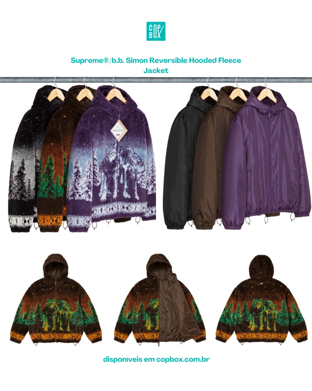 Supreme®/b.b. Simon Reversible Hooded Fleece Jacket – Talvez a peça mais “usável” da collab, esse fleece reversível mistura conforto e visual statement: de um lado, o lado mais “clean”; do outro, texturas, cores e detalhes que remetem aos clássicos cintos da marca.