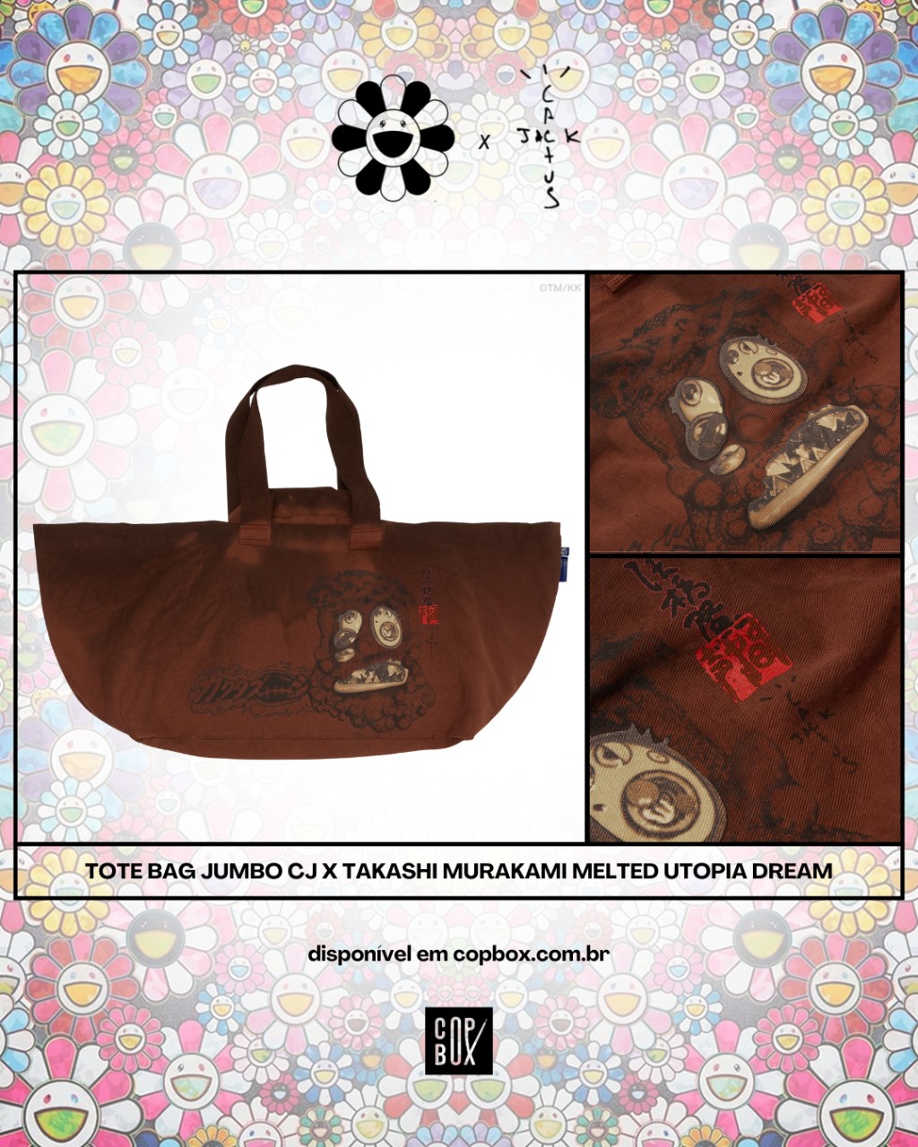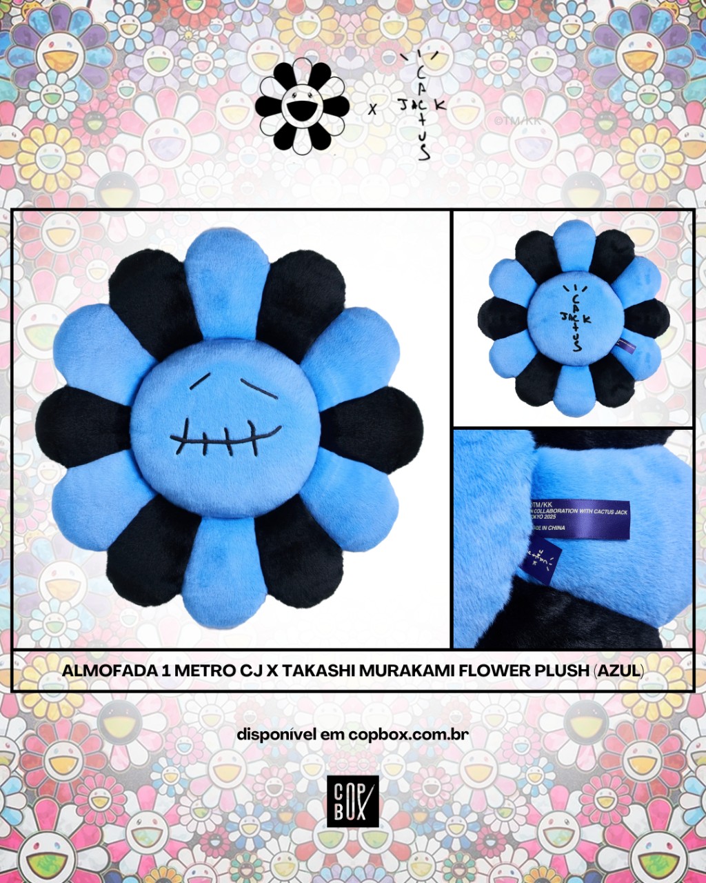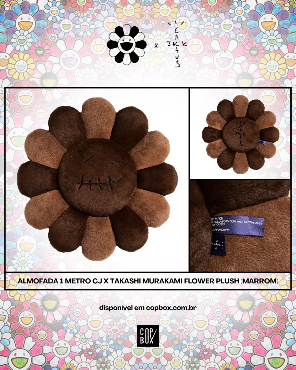 Itens disponíveis incluem: hoodies, tees, tote bags, plushes gigantes (sim, pelúcias de flor), tudo estampado com a assinatura de Murakami repensada pela estética mais crua da Cactus Jack.