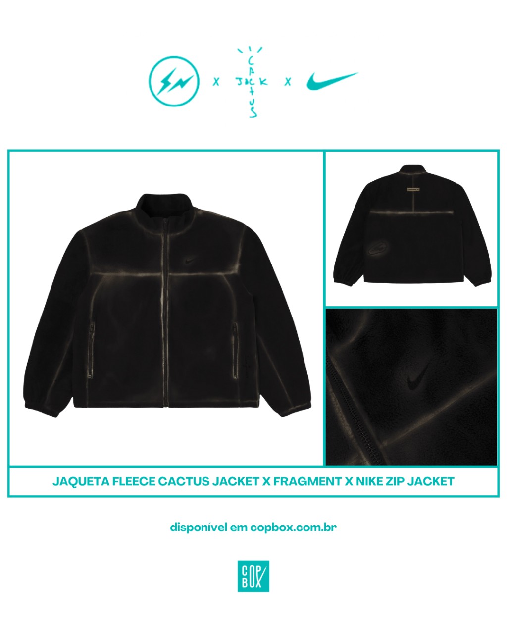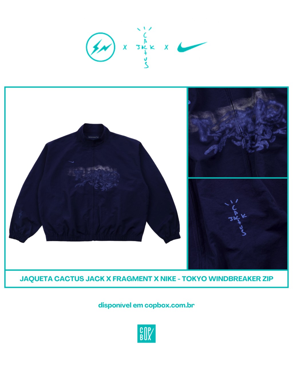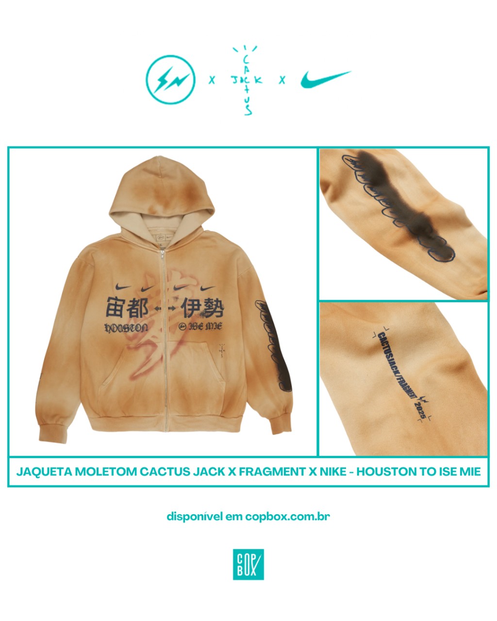 No merch dessa collab, também há roupas: camisetas, hoodies, até jaquetas com a marca Nike + Fragment + Cactus Jack.