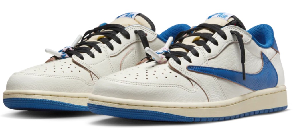 A peça mais falada recentemente é a Air Jordan 1 Low OG SP, com colorway “Sail / Black / Muslin / Military Blue”. Lançada via o site do Travis, ela não foi distribuída pela SNKRS, o que torna ainda mais exclusiva.