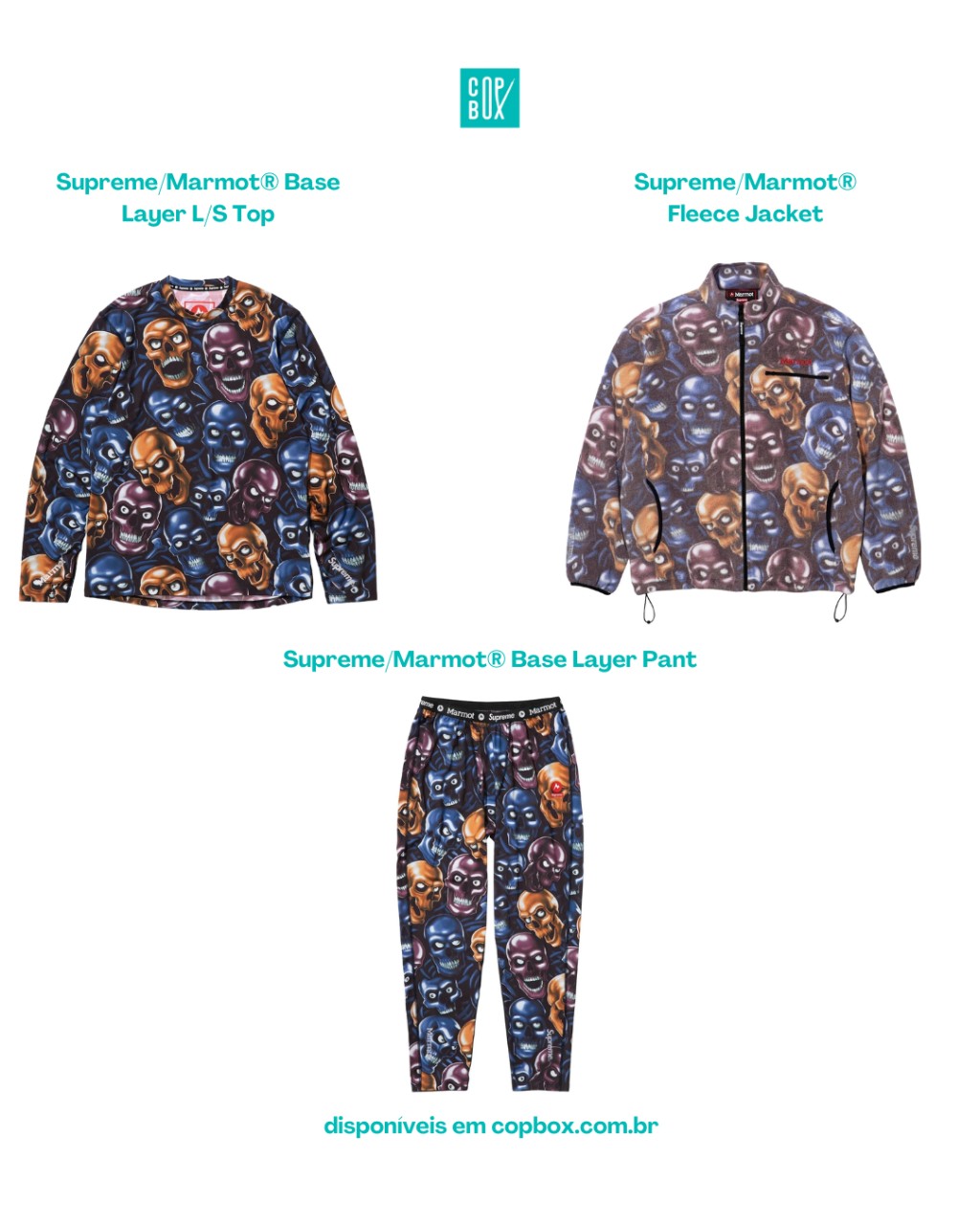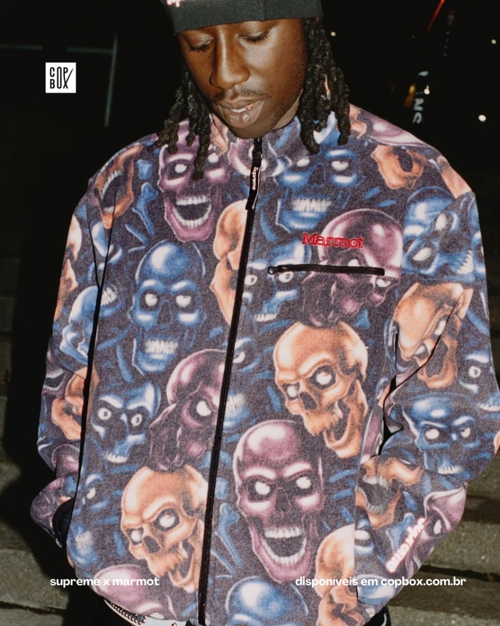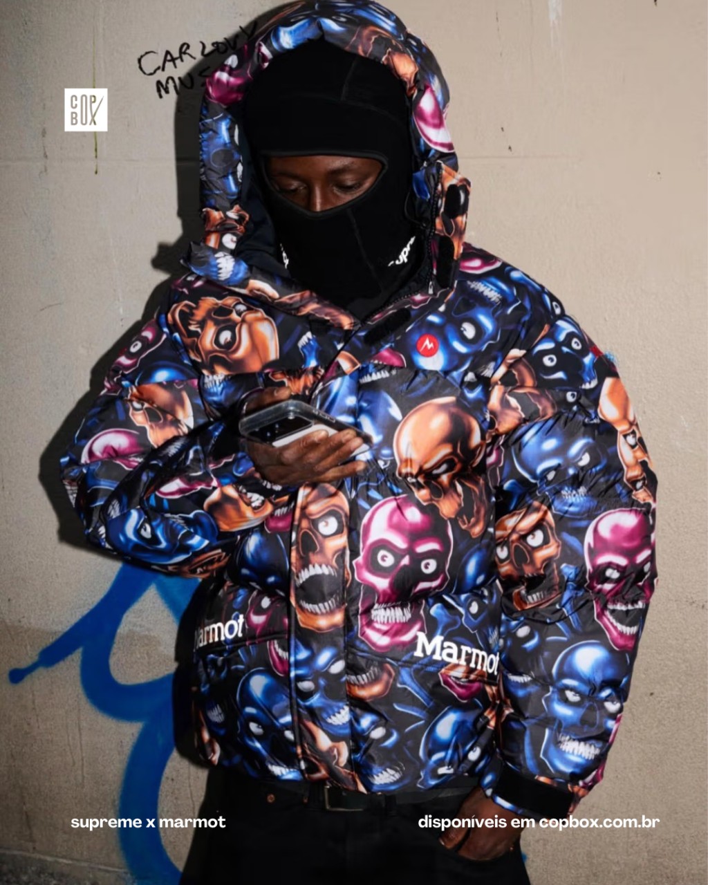 Na reta final da temporada Fall/Winter 2025, a Supreme reserva uma das colabs mais técnicas do ano: a parceria com a Marmot, marca clássica do mountaineering norte-americano. A coleção chega como destaque da FW25 Week 18, focada em enfrentar frio extremo com tecnologia de ponta – tudo isso coberto pelo icônico gráfico Skull Pile multicolorido assinado pela Liquid Blue.