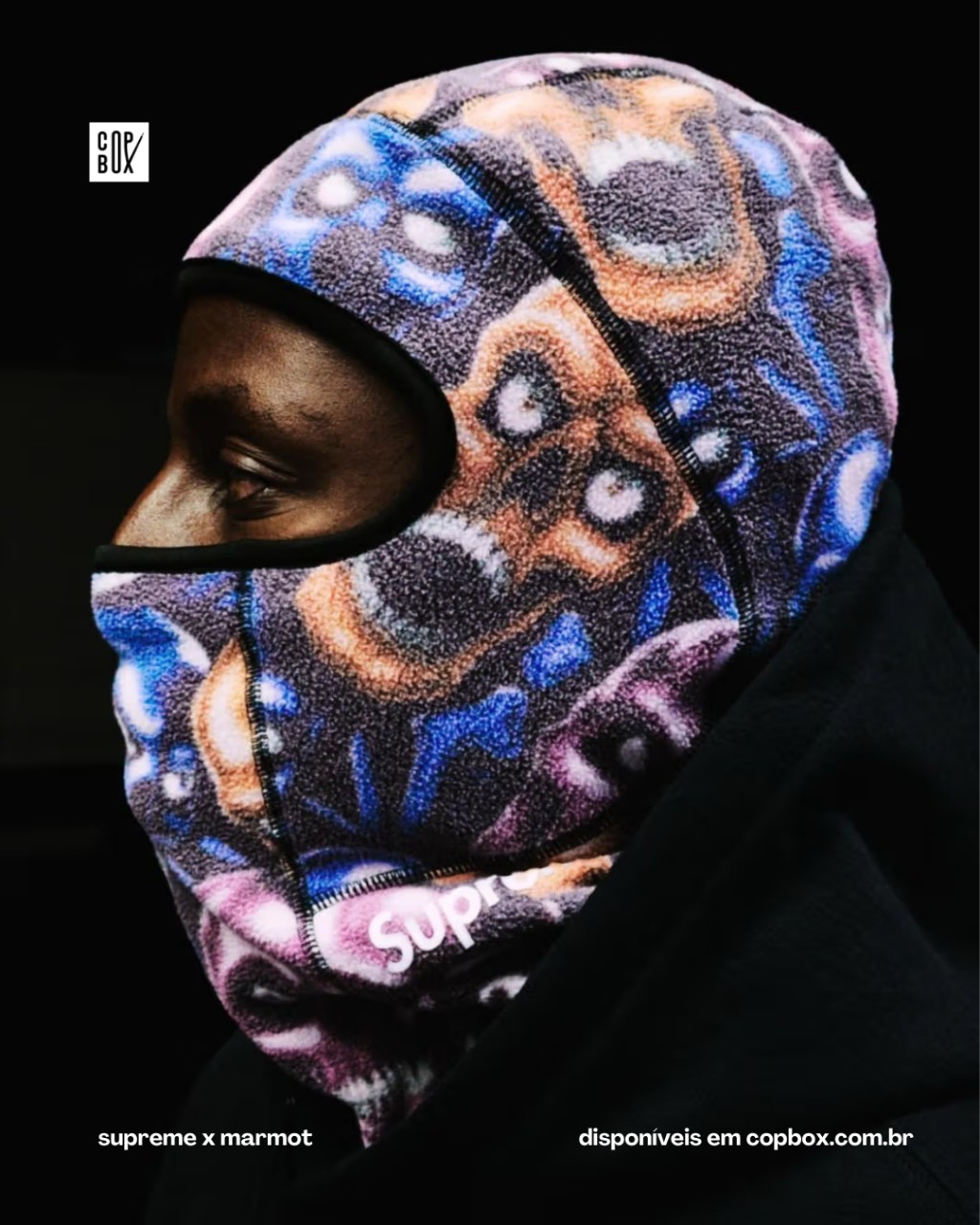 Balaclava técnica com foco em proteção máxima de rosto e pescoço. Aqui, a Supreme e a Marmot elevam o acessório a outro nível, transformando algo funcional em peça de estilo, novamente com a presença do Skull Pile. -