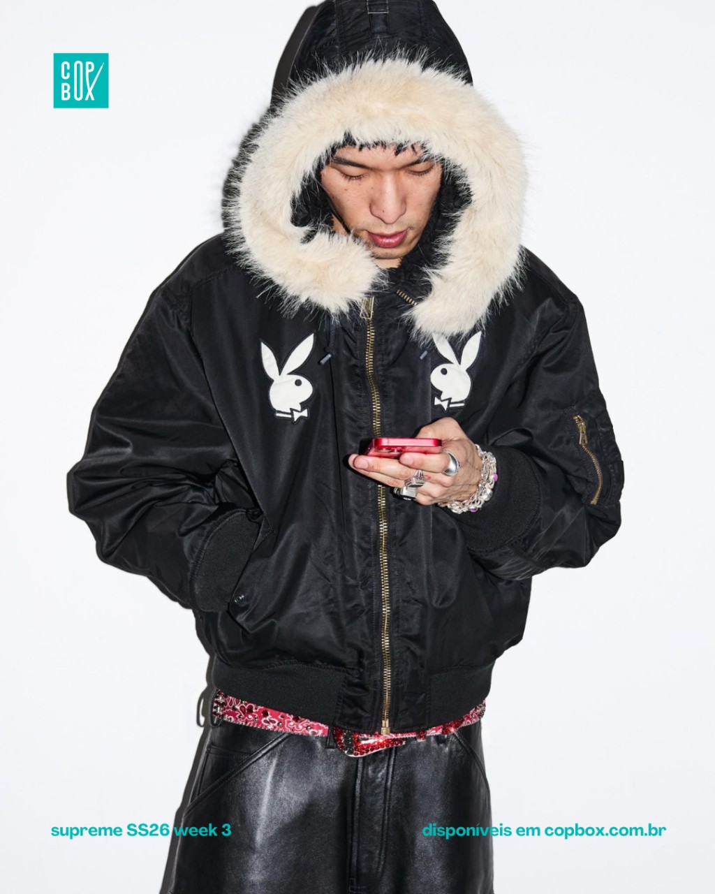 O grande headline da SS26 Week 3 é a volta da parceria entre Supreme e Playboy. As duas marcas colaboram desde 2011 – de moletom e camisa polo até calças e jaquetas – e não soltam nada juntas desde 2017, o que torna esse retorno especialmente barulhento.