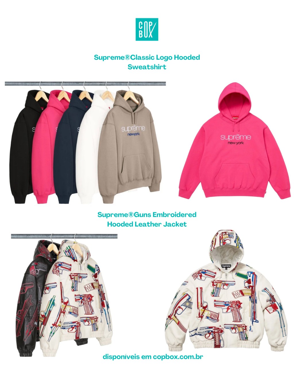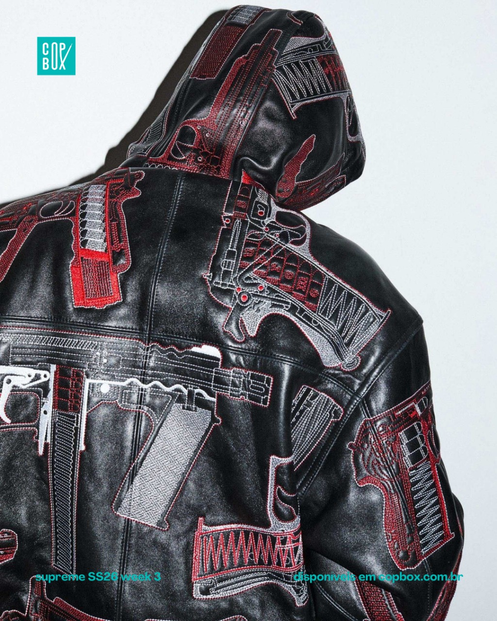 Jaqueta de couro com capuz e arte temática de armas (guns), seguindo a linha de peças mais polêmicas e colecionáveis da Supreme.