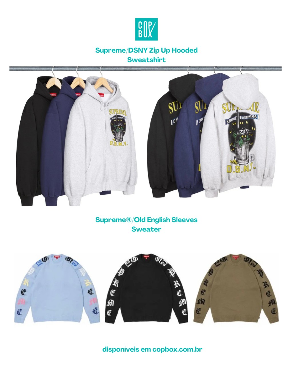 Hoodie inspirado no New York City Department of Sanitation (DSNY), continuando a tradição da marca de homenagear/agitar símbolos de serviços públicos de Nova York (já teve NYPD, FDNY, MTA em outras eras).
