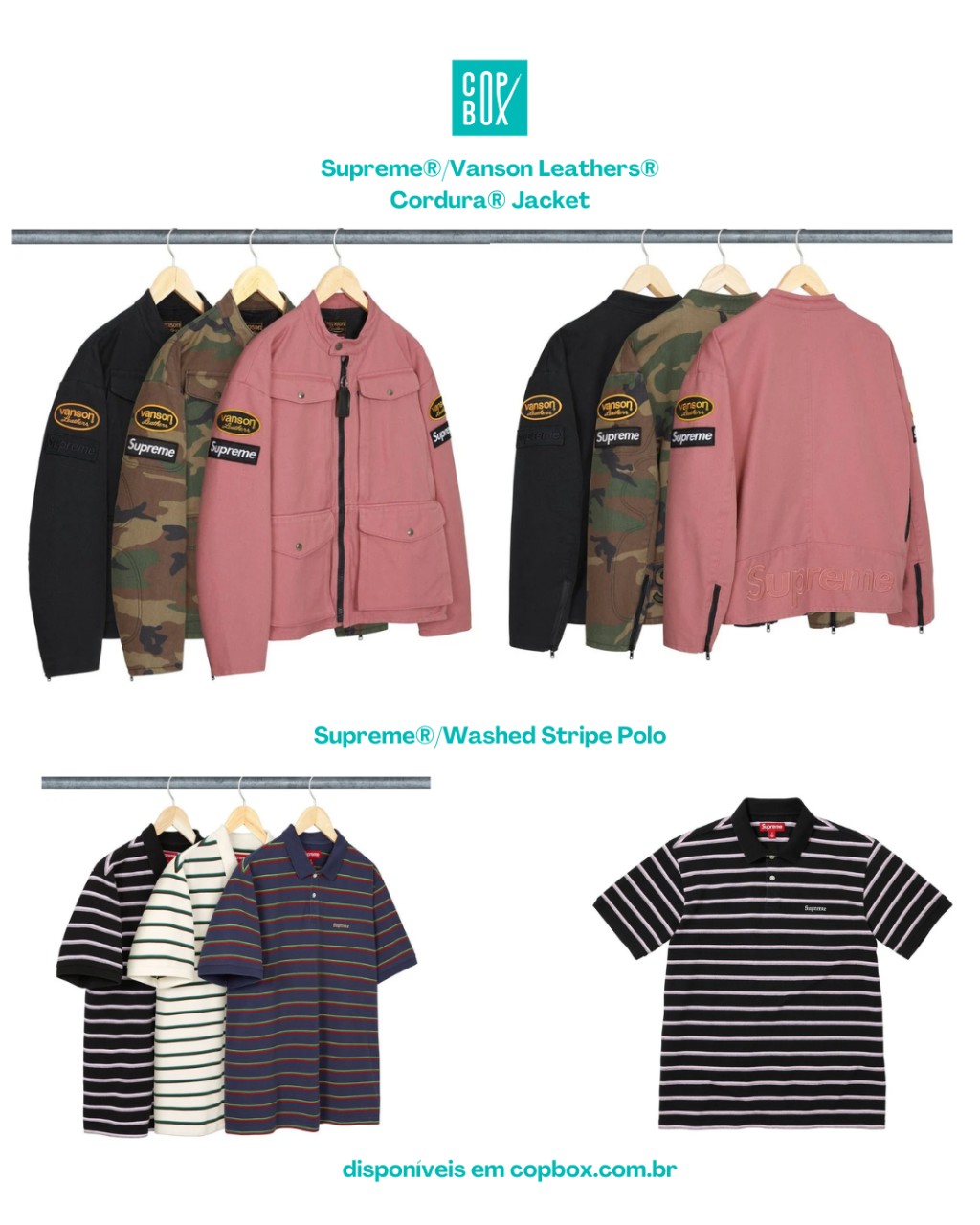 Polo listrada, lavada, com cara de peça já “vivida”, muito na onda skate/golf/grunge que a Supreme adora explorar.