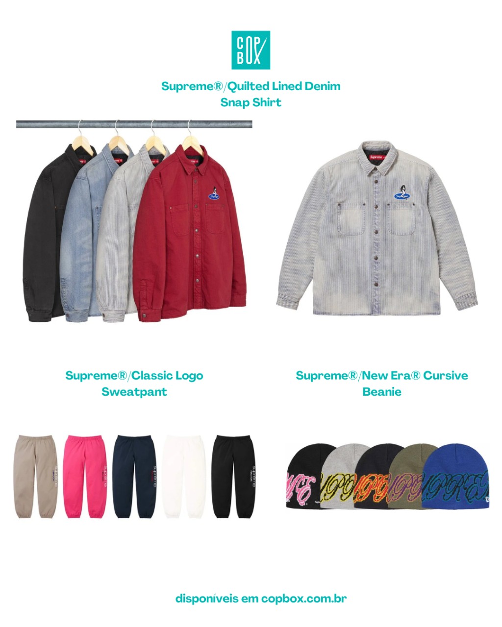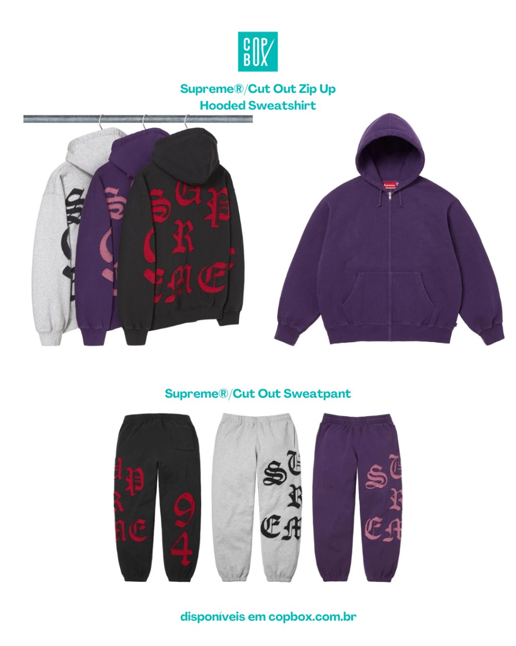 Conjunto moletom + calça com logo clássico “Supreme” em tipografia reta, perfeito pra quem quer “uniforme da temporada” sem graphic muito carregada.